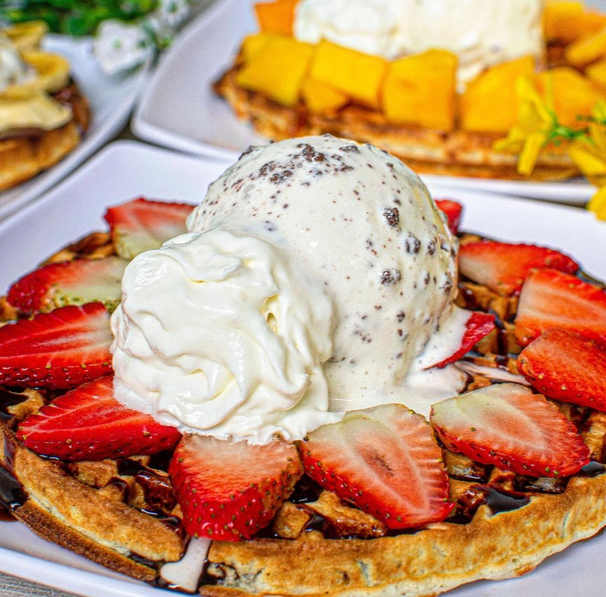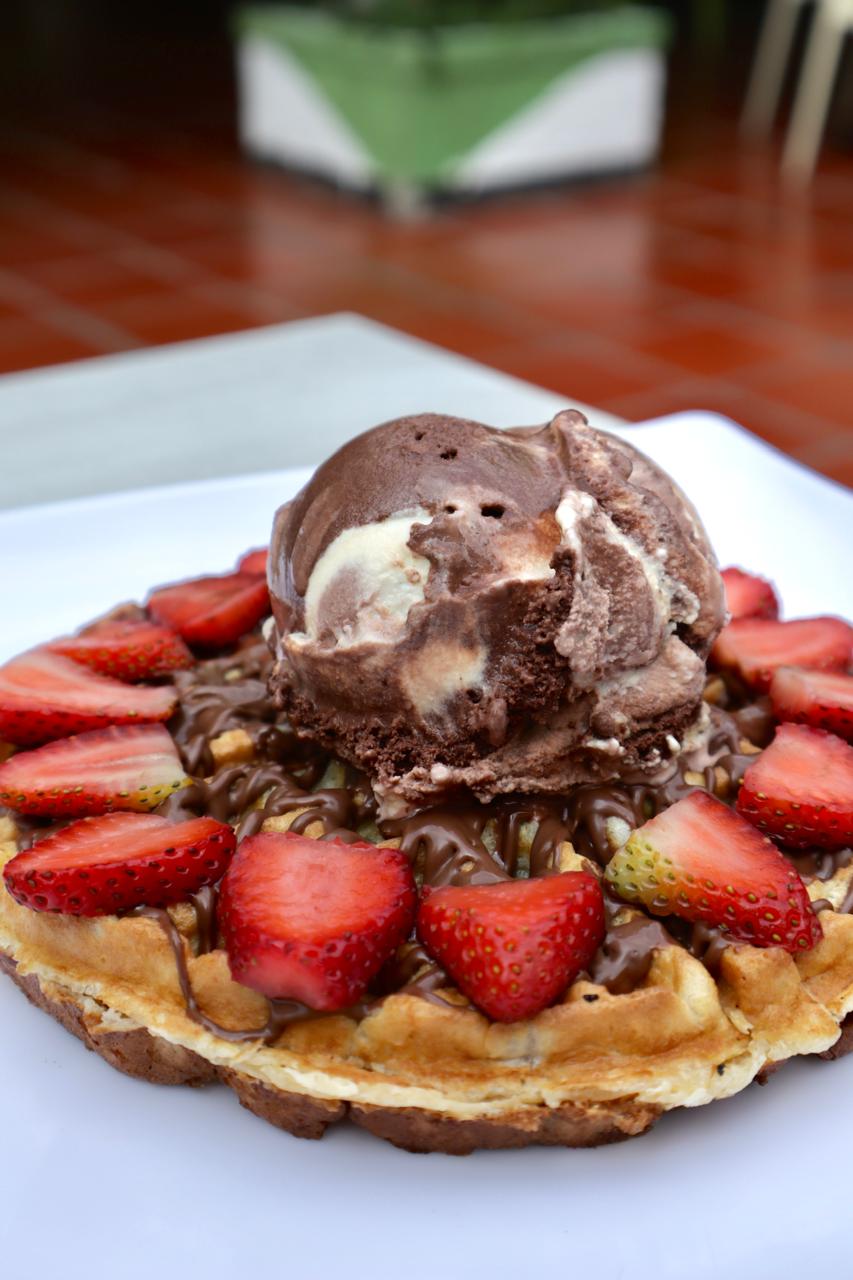 Delicioso waffle con 1 bola de helado, 1 o 2 salsas y 1 fruta (sabores a elección).