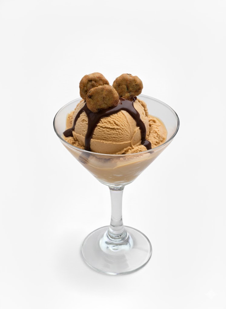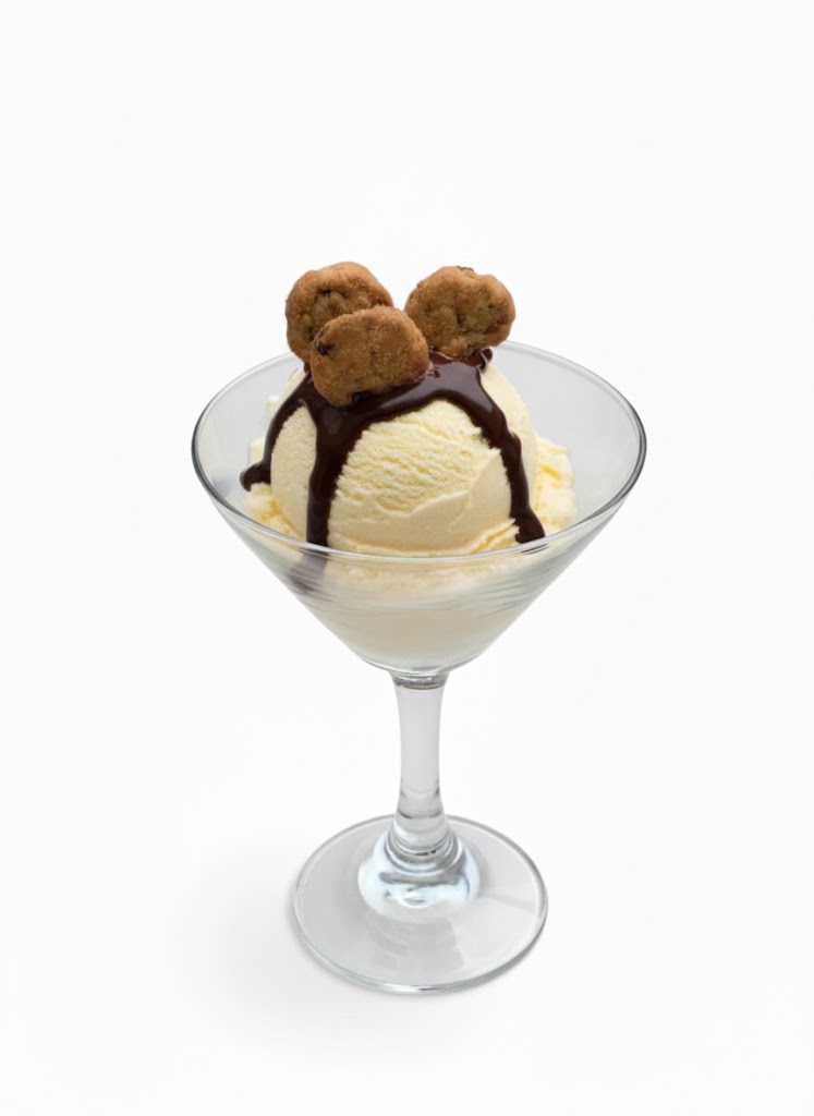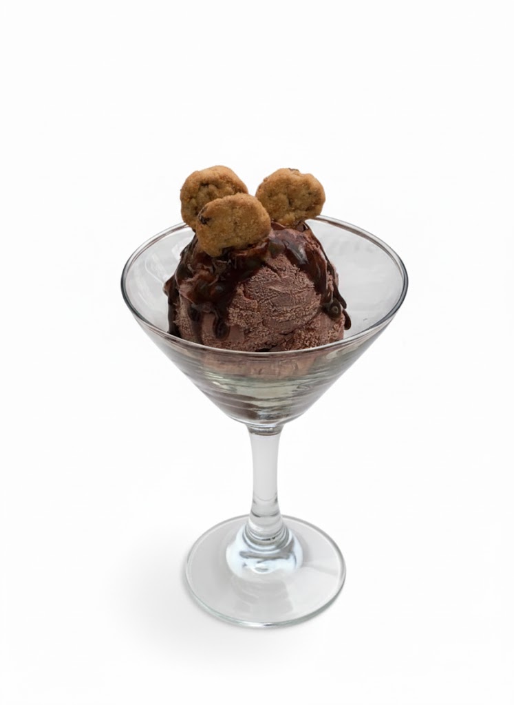 Trozos de brownie, salsa de chocolate, helado de vainilla, brownie, chips de chocolate y galleta crocante.