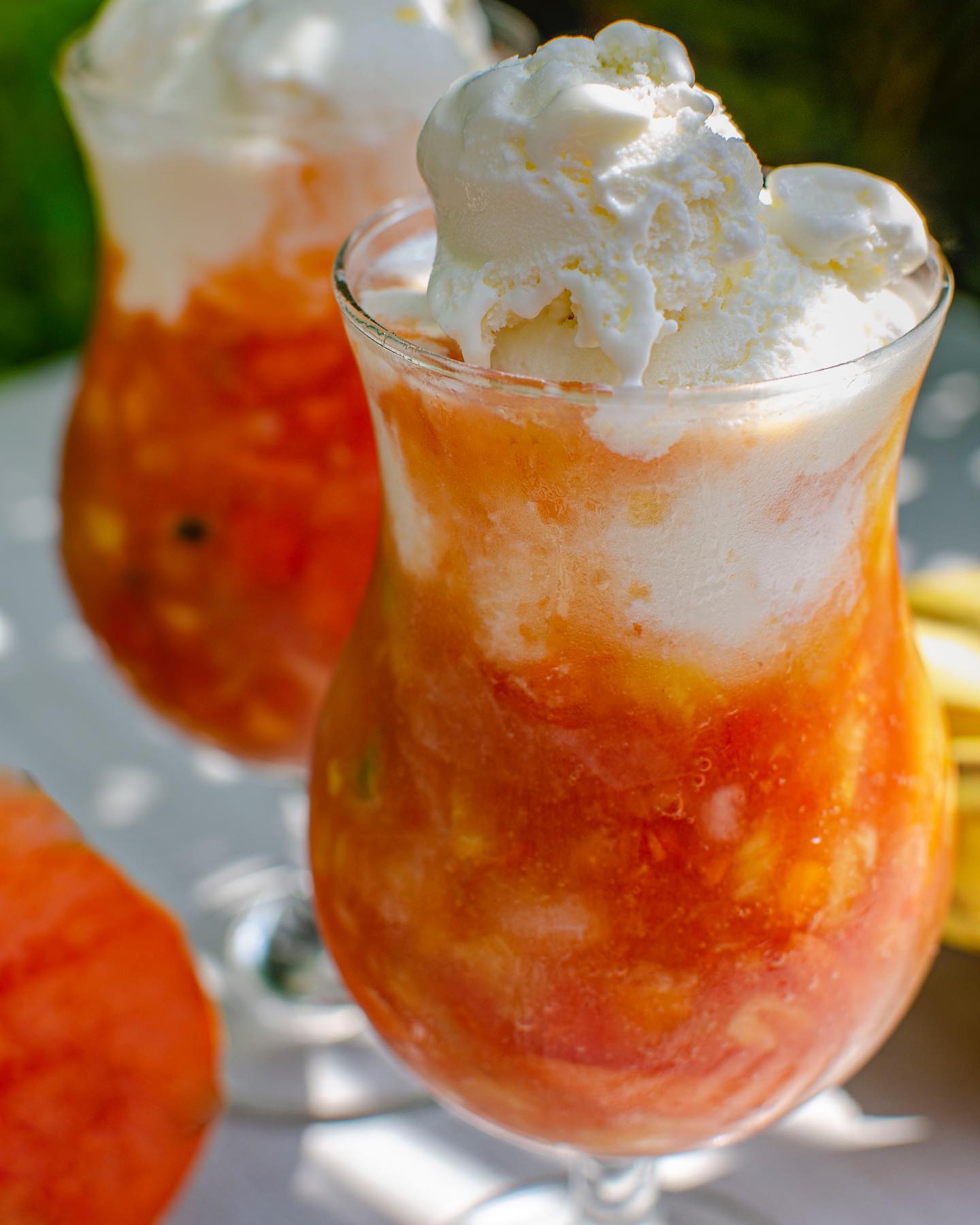 Deliciosa ensalada de frutas con mango, manzana, fresa, banano y piña, acompañada con crema de la casa, queso rayado y una bola de helado para darle el toque final perfecto.