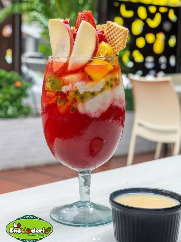 Deliciosa ensalada de frutas con mango, manzana, fresa, banano y piña, acompañada con crema de la casa, queso rayado y una bola de helado (40 gm) para darle el toque final perfecto.