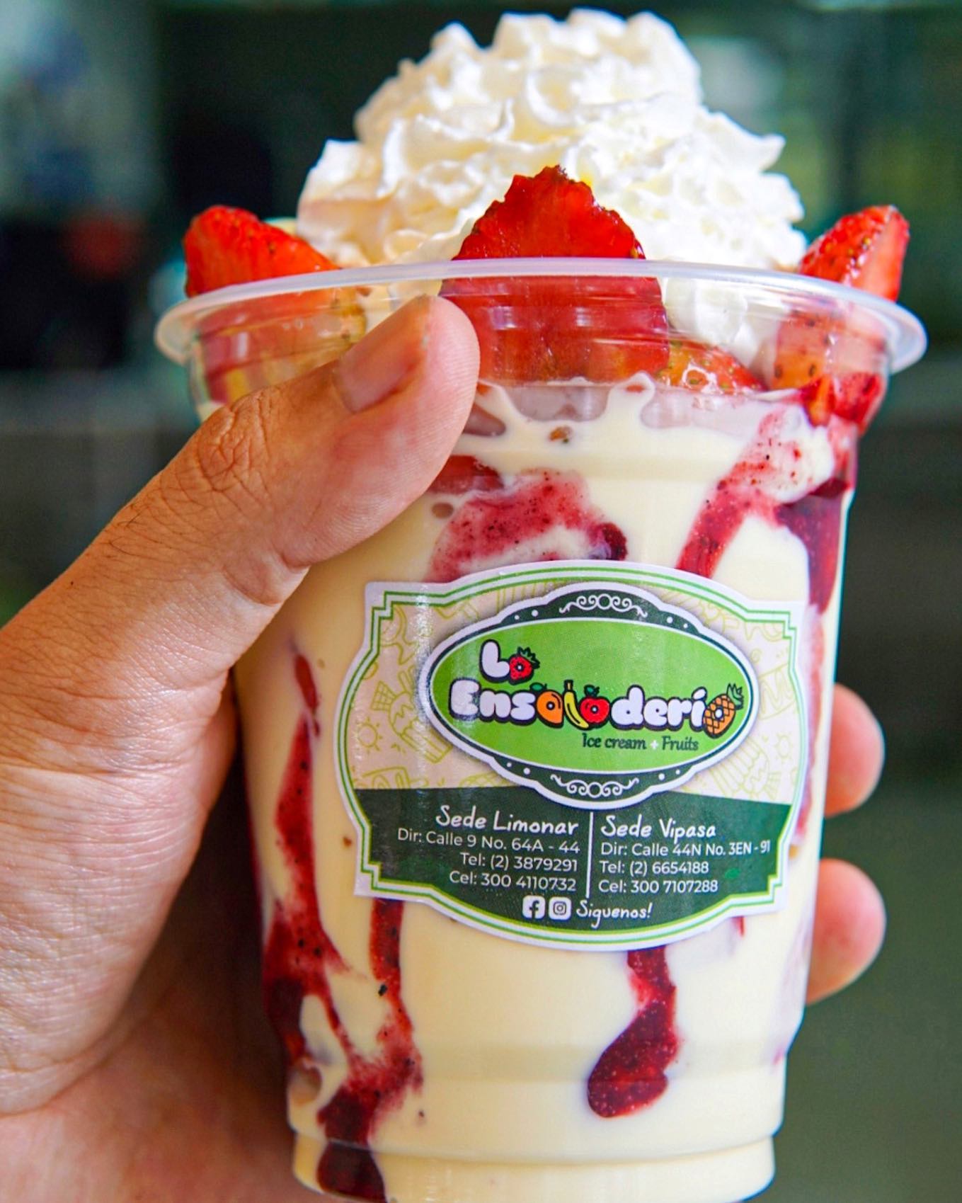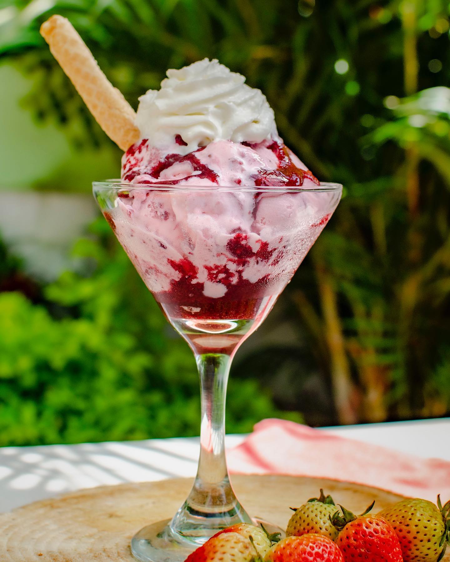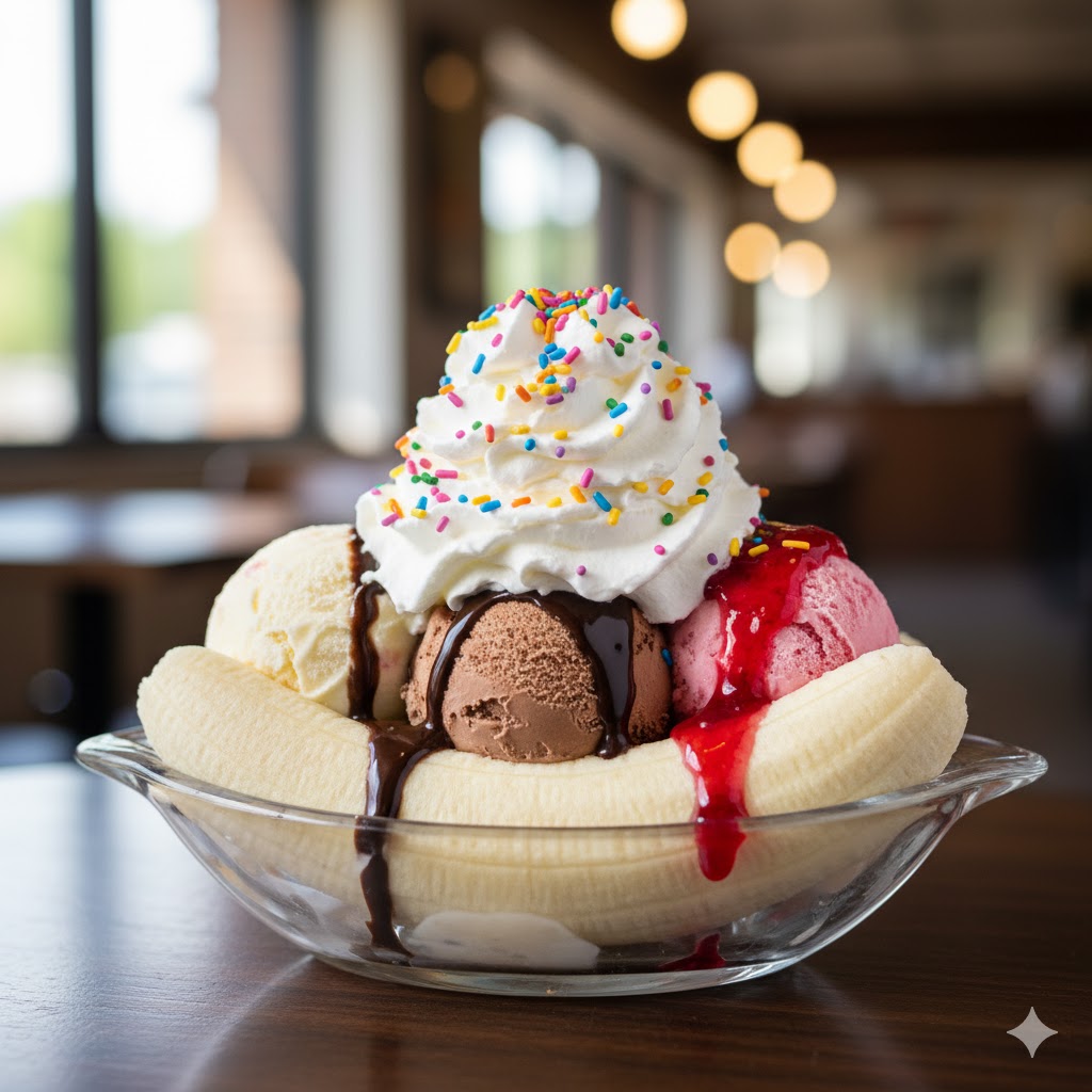 Banano, 3 bolas de helado (sabor a elección), salsa de frutos rojos, salsa de chocolate, chantilly y lluvia de colores.