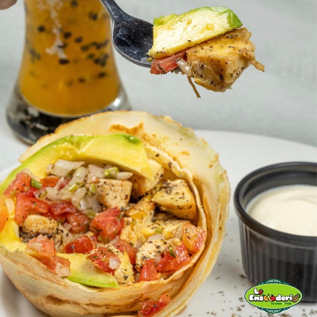 pollo, picoé gallo, pure de maduro, aguacate y aderezo