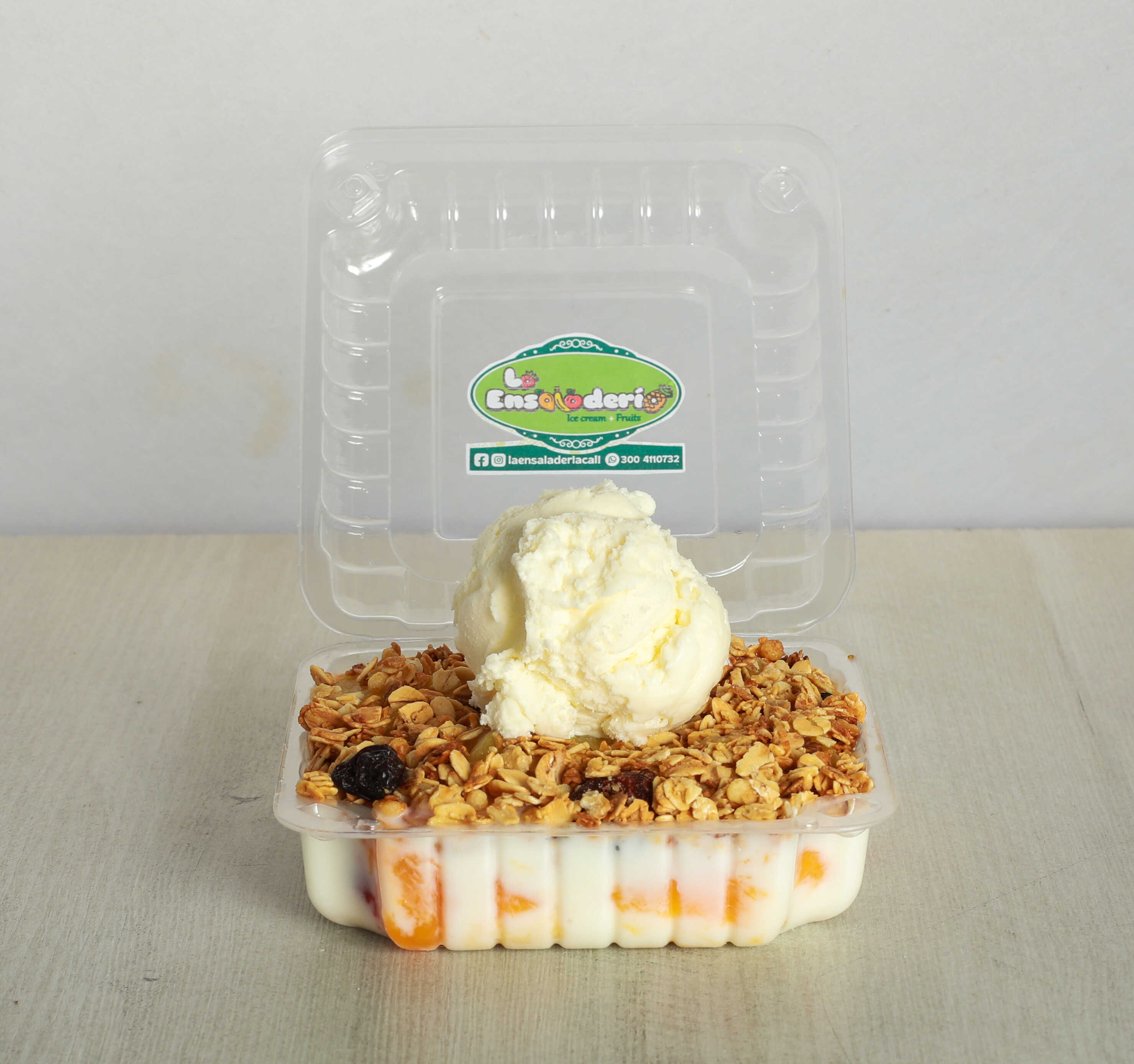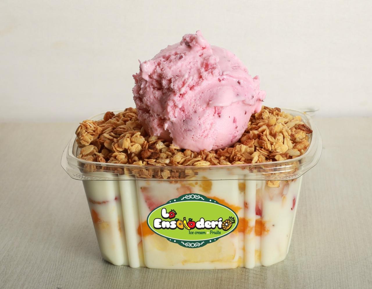 Deliciosa ensalada de frutas con manzana, mango, banano, piña y fresa, servida con yogurt Finesse, granola crocante y una bola de helado para un toque dulce y refrescante.