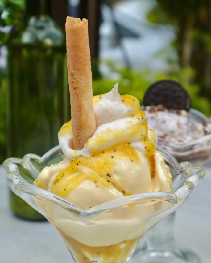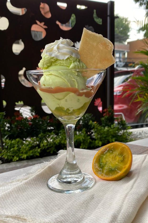 Merengón, salsa de lulo, helado de lulo y maracuyá, salsa de maracuyá, chantillí y barquillo crocante.