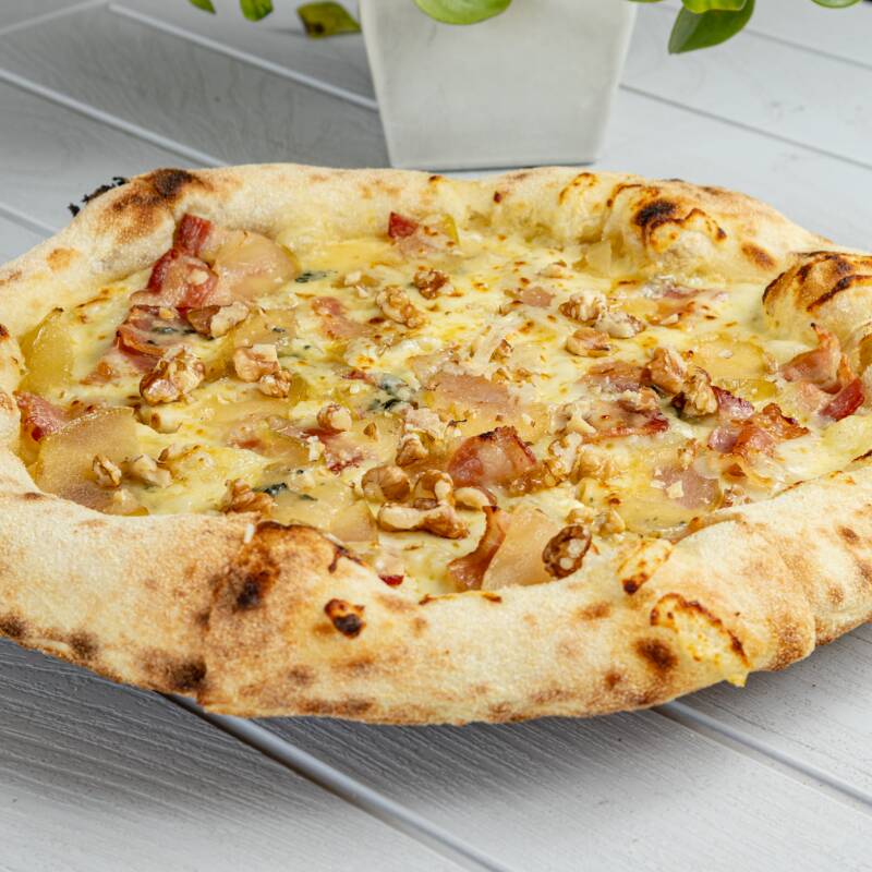 Pizza con rodajas de manzana caramelizada, gorgonzola cremoso, panceta, nueces del nogal.