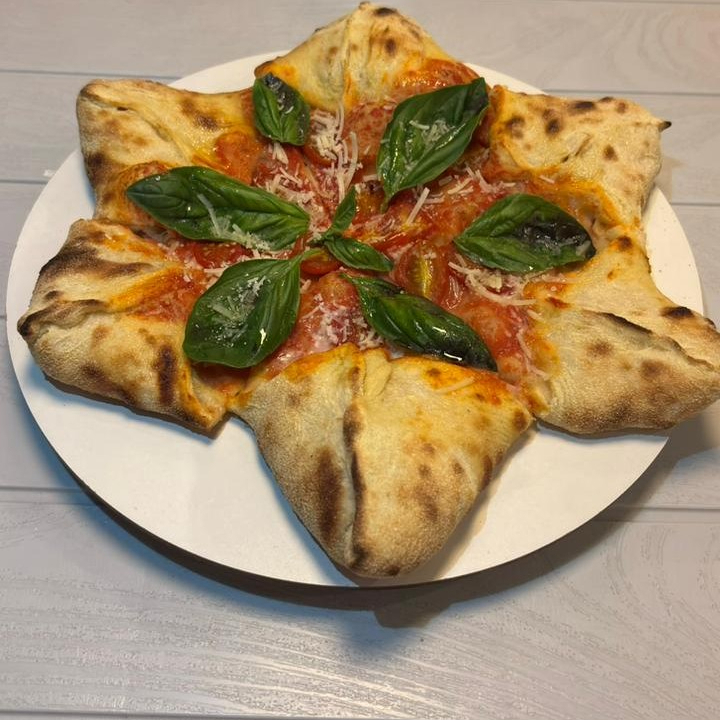 Pizza elaborada con masa dorada al horno y transformada en una estrella de seis puntas, rellenos cálidos de jamón horneado y mozzarella di bufala con un centro fresco y elegante de pomodoro, cherry horneado, albahaca y parmesano. un contraste delicioso entre suavidad, luz y tradición.i