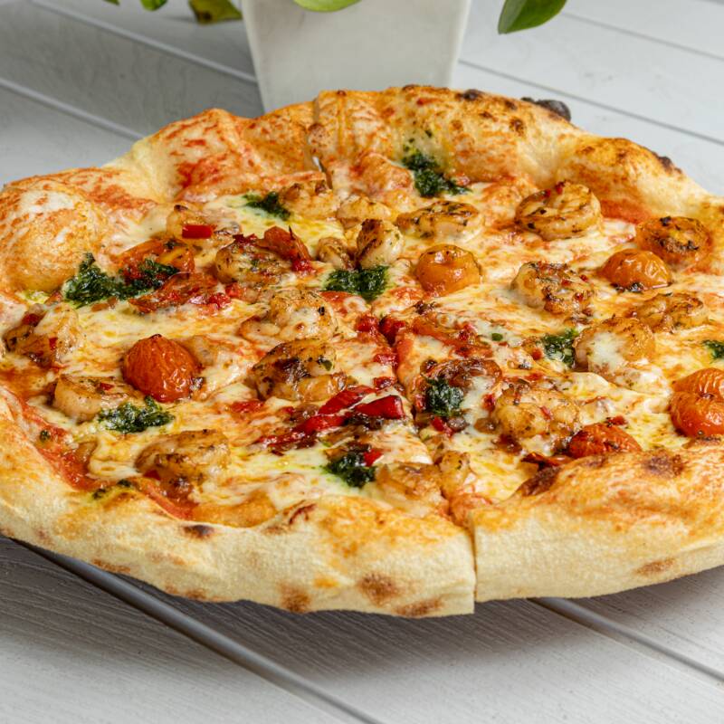 Pizza con camarones flameados en vino blanco, tomate cherry, chimichurri, pico de gallo.