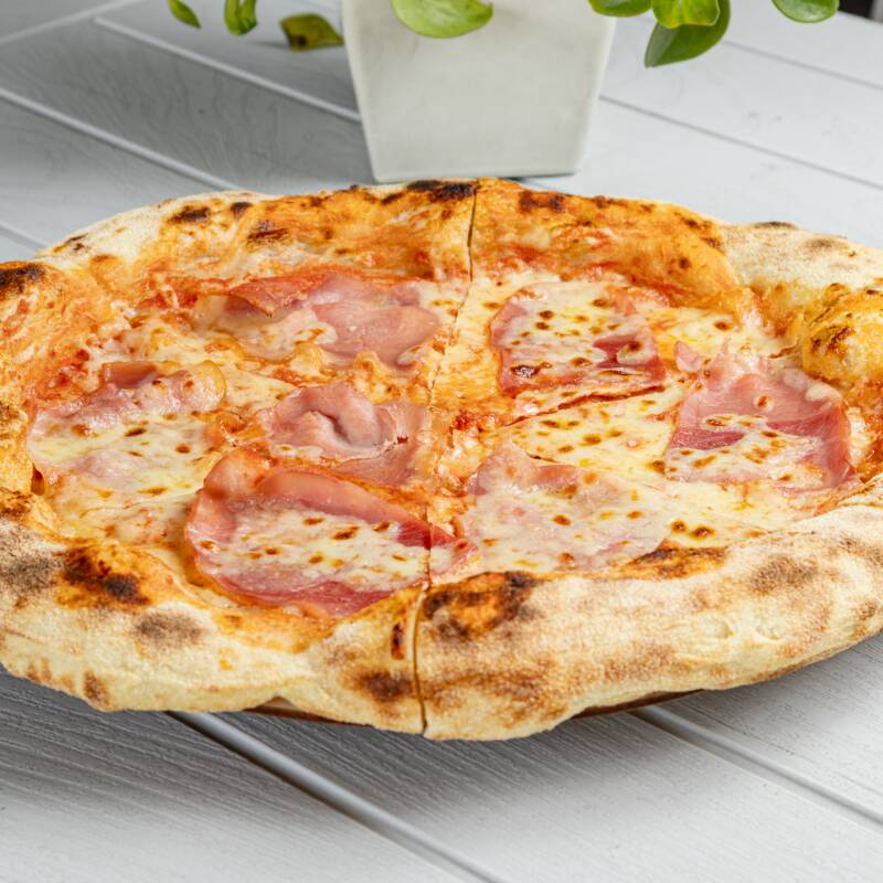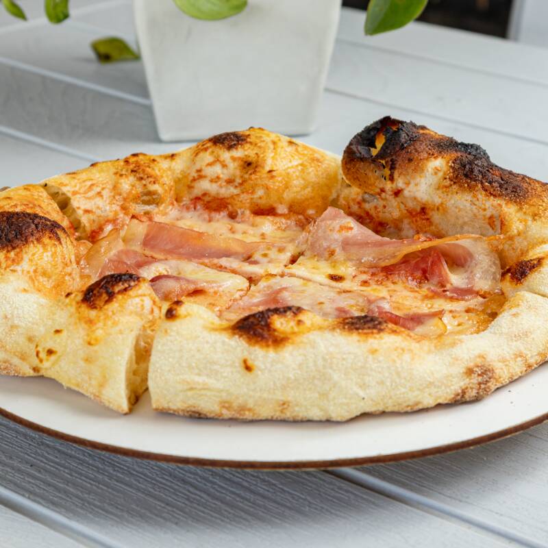 Pizza con láminas de jamón italiano y queso correctamente derretido, una melodía de sabores clásicos.