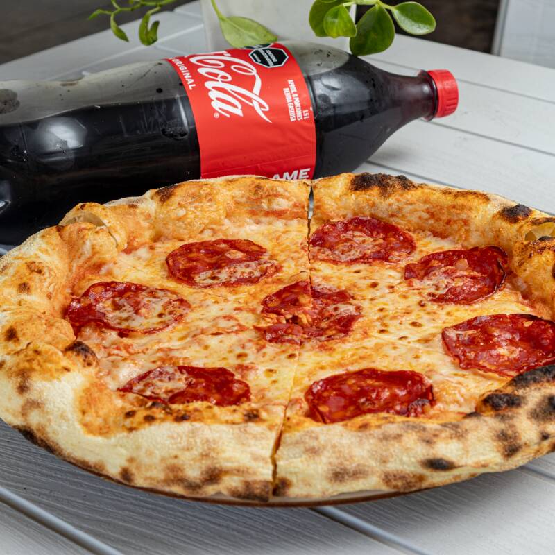 Pizza diavola de masa artesanal tipo napolitana fermentada por 24 horas con pepperoni italiano listo para cautivar tus sentidos, de 30cm, 6 porciones + coca cola 1.5 litros