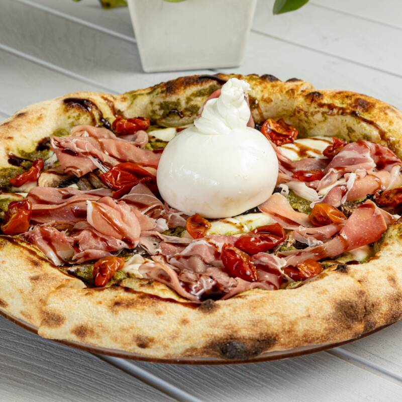 Pizza con Mozzarella de búfala, portobello salteado, prosciutto, burrata, tomate cherry confitados y crema de vinagre balsámico.