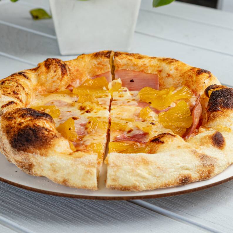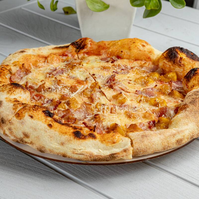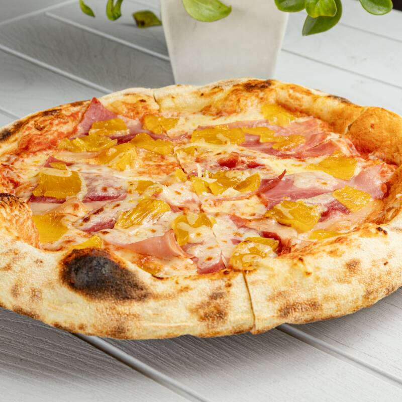 Pizza con trozos de piña dulce y jamón ahumado que evocan sabores tropicales con la elegancia italiana.