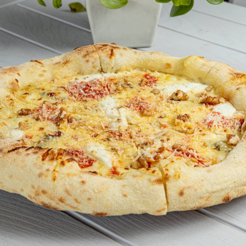 Pizza con queso gorgonzola, provolone, parmesano, crema mozzarella de búfala.