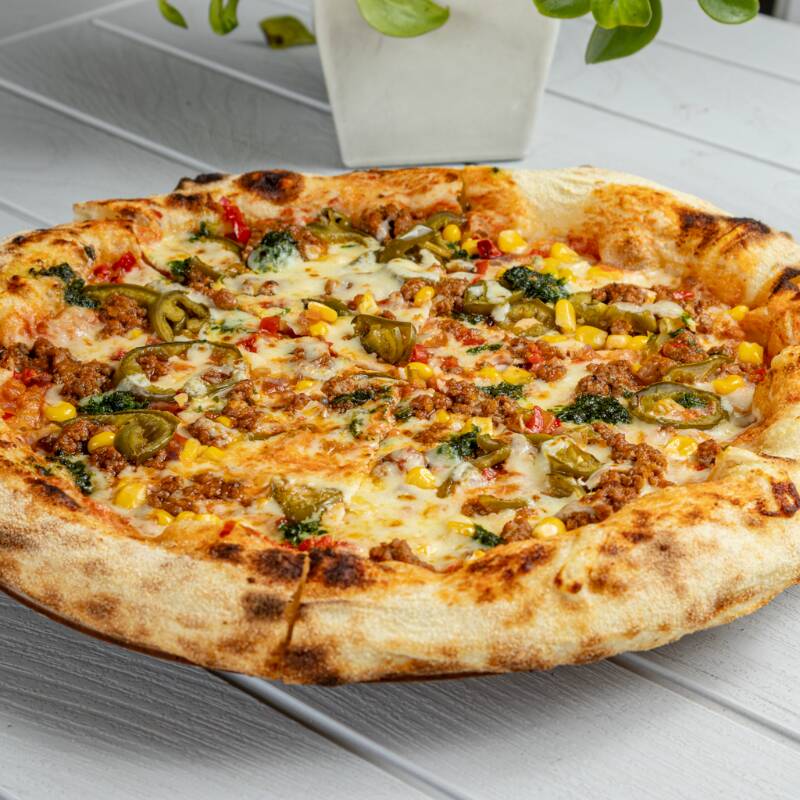 Carne boloñesa, jalapeños, maíz dulce, pico de gallo y chimichurri.