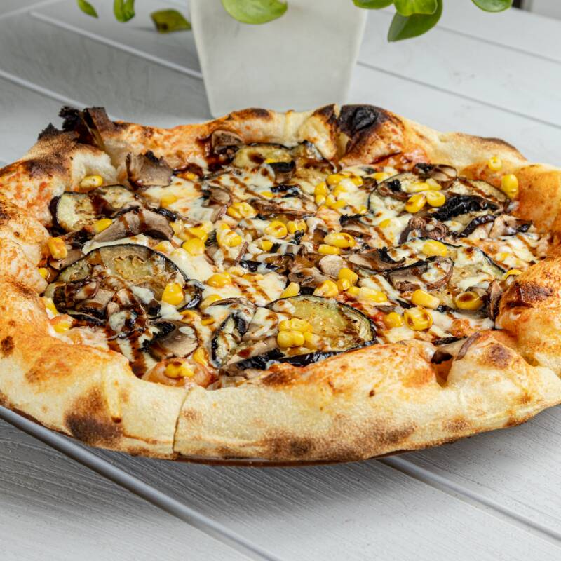 Pizza con Portobellos, maíz dulce, láminas de berenjena asada y crema de vinagre balsámico (vegetariano).