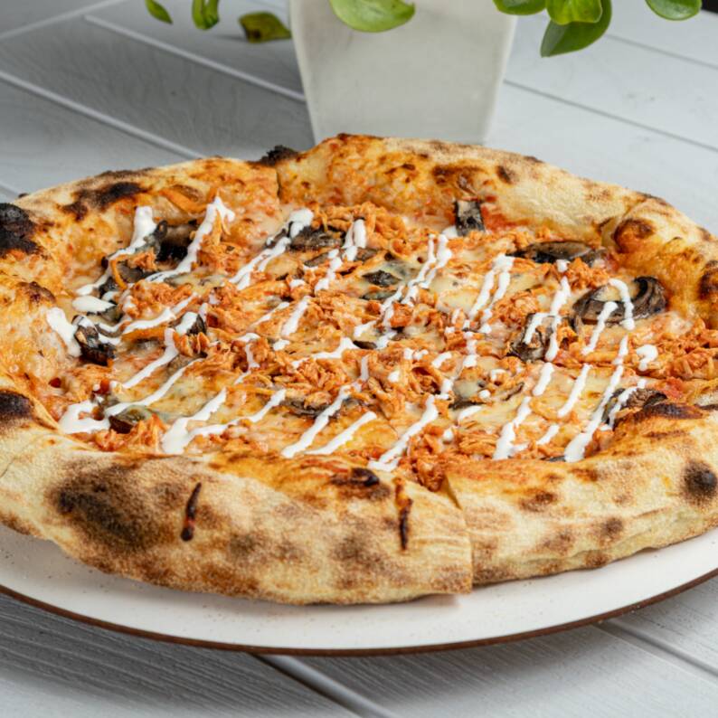 Pizza con portobellos salteados y pollo sazonado con un toque de especias que te llevan directo a la perfección.