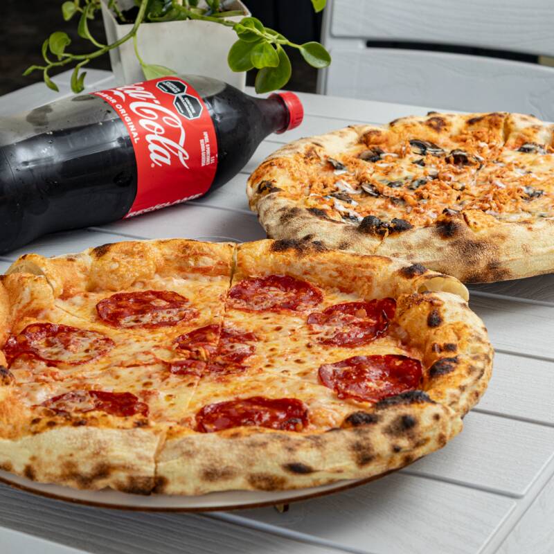 2 Pizzas clásicas de masa artesanal tipo napolitana fermentada por 24 horas, pizza tropicale (trozos de piña dulce, jamón ahumado) + pizza sussurro (portobello salteado, pollo sazonado y especias) de 30cm, 6 porciones + coca cola 1.5 litros