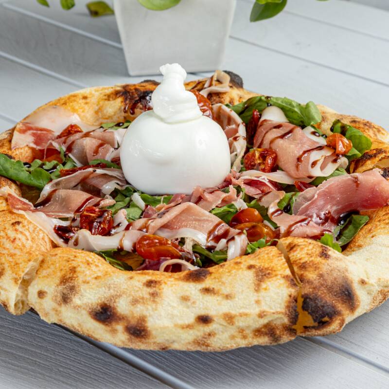 Pizza con Lonjas de prosciutto, tomates cherry confitados, burrata de búfala, rúcula y crema de vinagre balsámico.