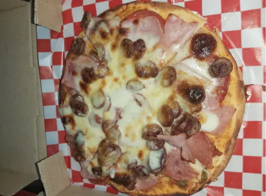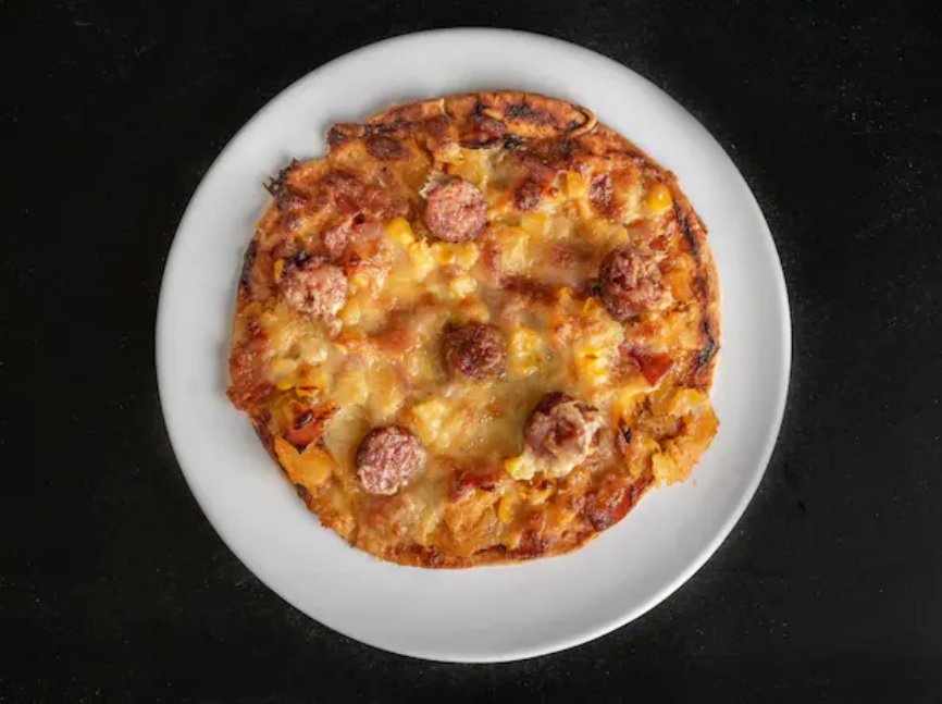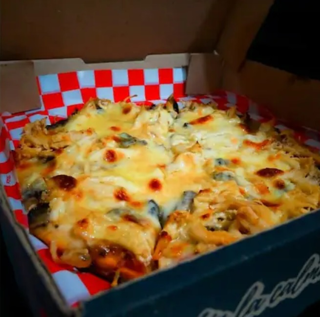 Maíz desgranado, pollo desmechado, queso industrial, salsa de la casa, queso mozzarella, tocineta.