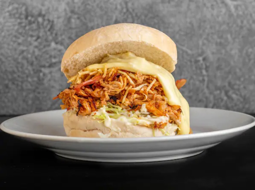 Pan artesanal, salsa de la casa, tomate, lechuga, showi, pollo desmechado, tocineta, cebolla, BBQ, ripio, queso mozzarella.
