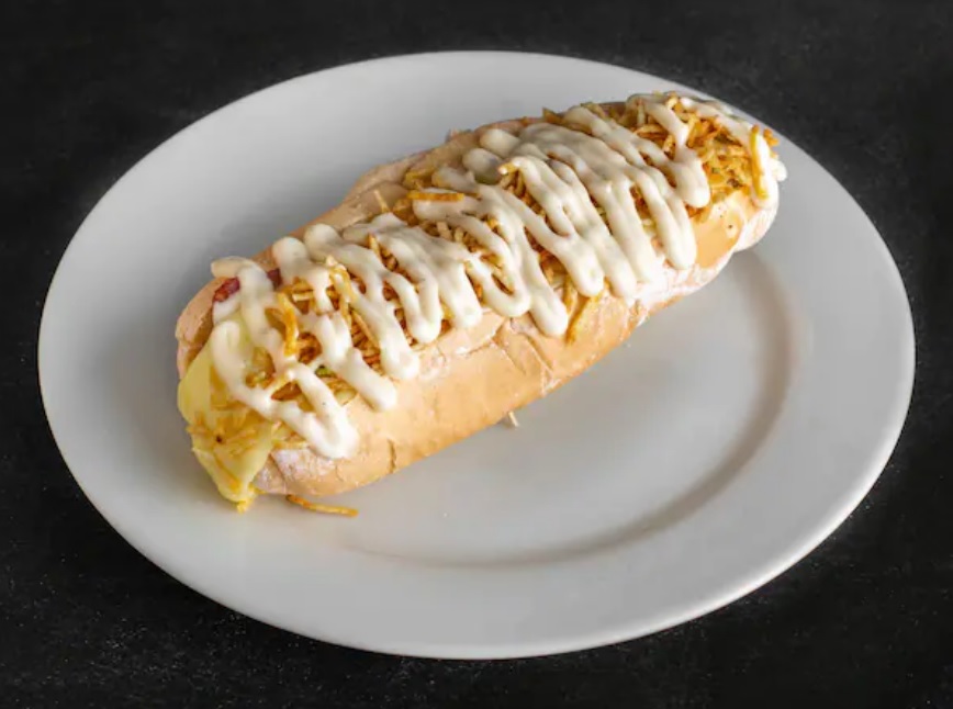 Pan artesanal, salchicha tipo americana, tocineta, queso fundido, salsa de la casa, salsa de pifia, showi y ripio.