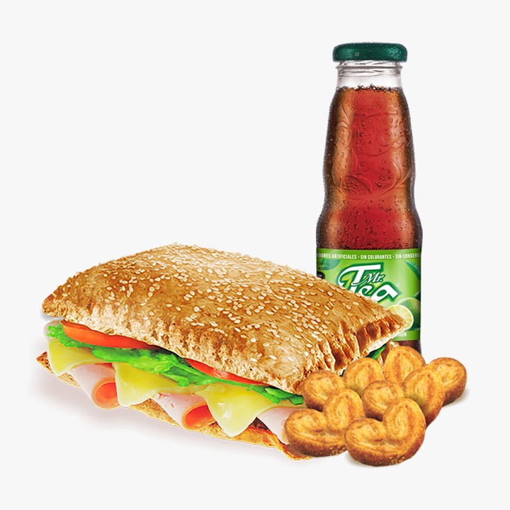 (Sandwich Hojaldrado relleno de Jamon Tipo Cordero o Pavo, queso gratinado, lechuga, tomate fresco y salsa de la casa + 1 bebida + 1 postre (brownie o Corazones