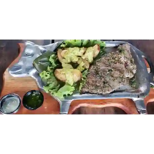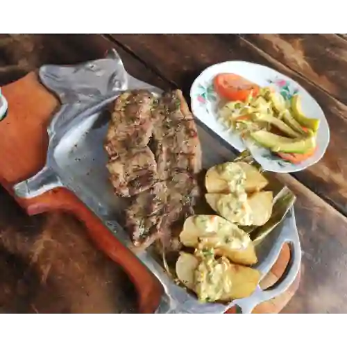 440 gr de Carne, ensalada de la casa, papa salada, arepa, chimichurri y salsa de ajo.