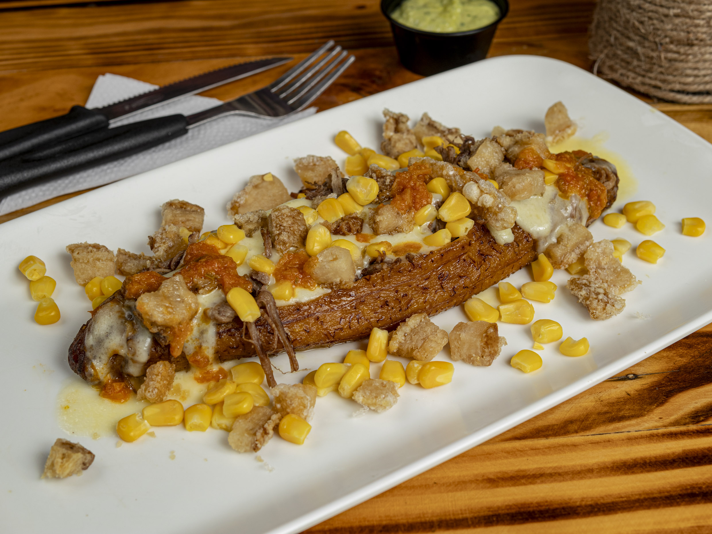 Trocitos de salchicha, maicitos, queso doble crema, salsa BBQ y guacamole.