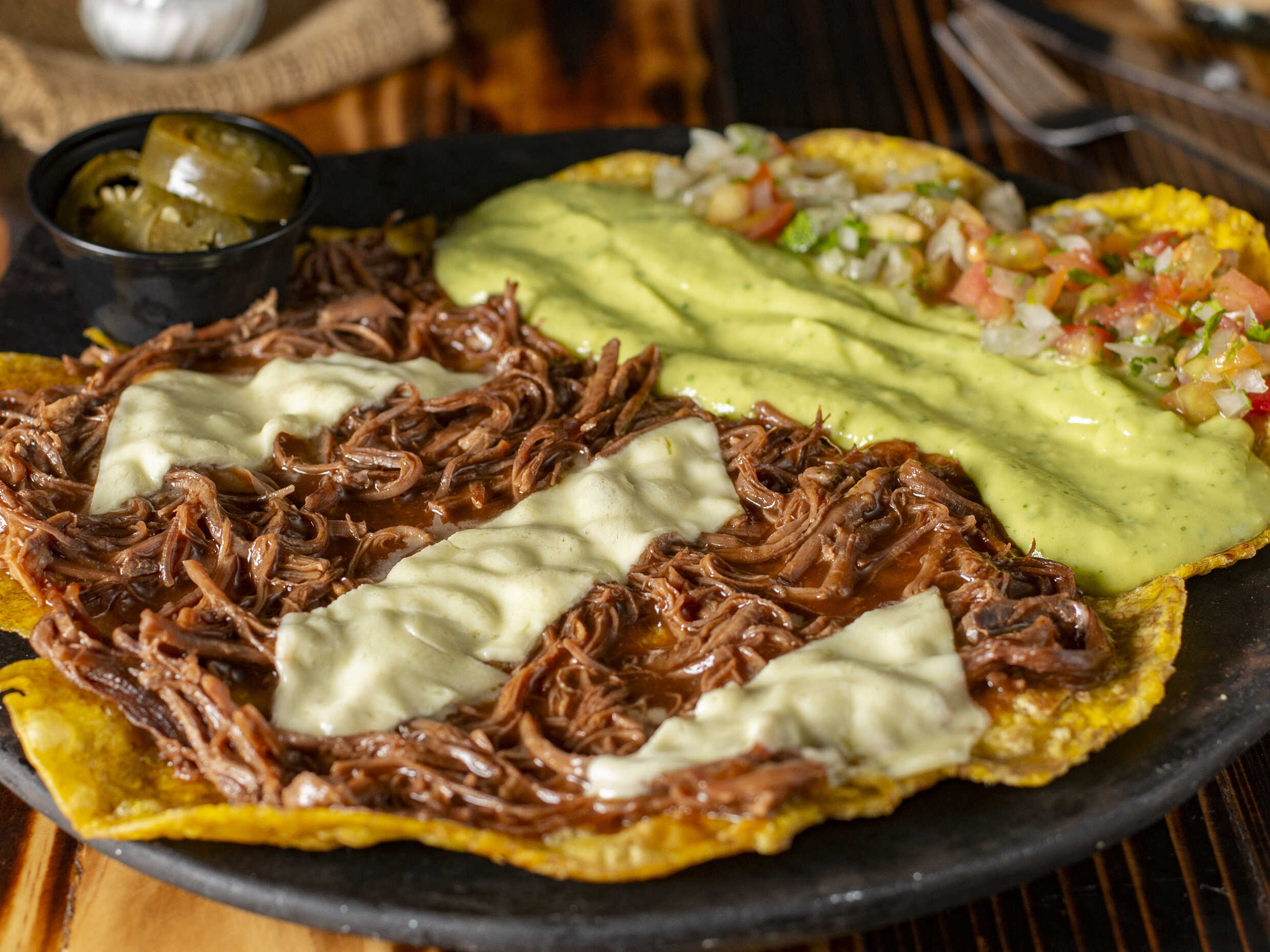 Carne desmechada bañada en BBQ, guacamole, pico de gallo, queso doble crema y jalapeños.