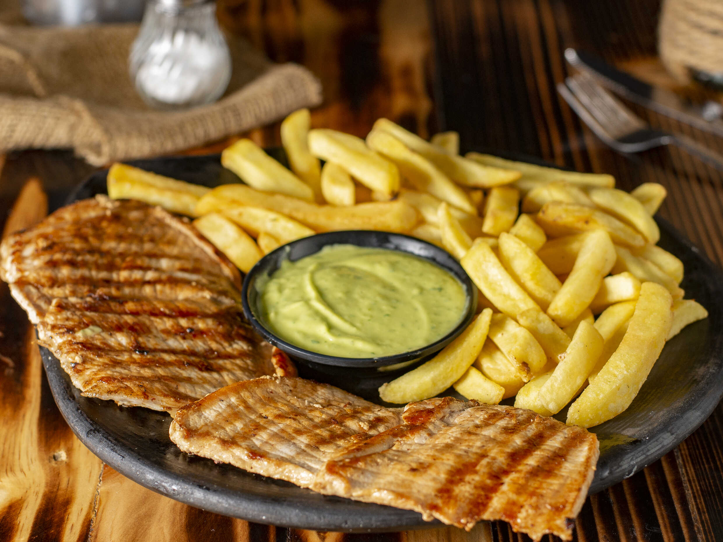 160 g de lomo de cerdo con 250 g Papa criolla y guacamole.