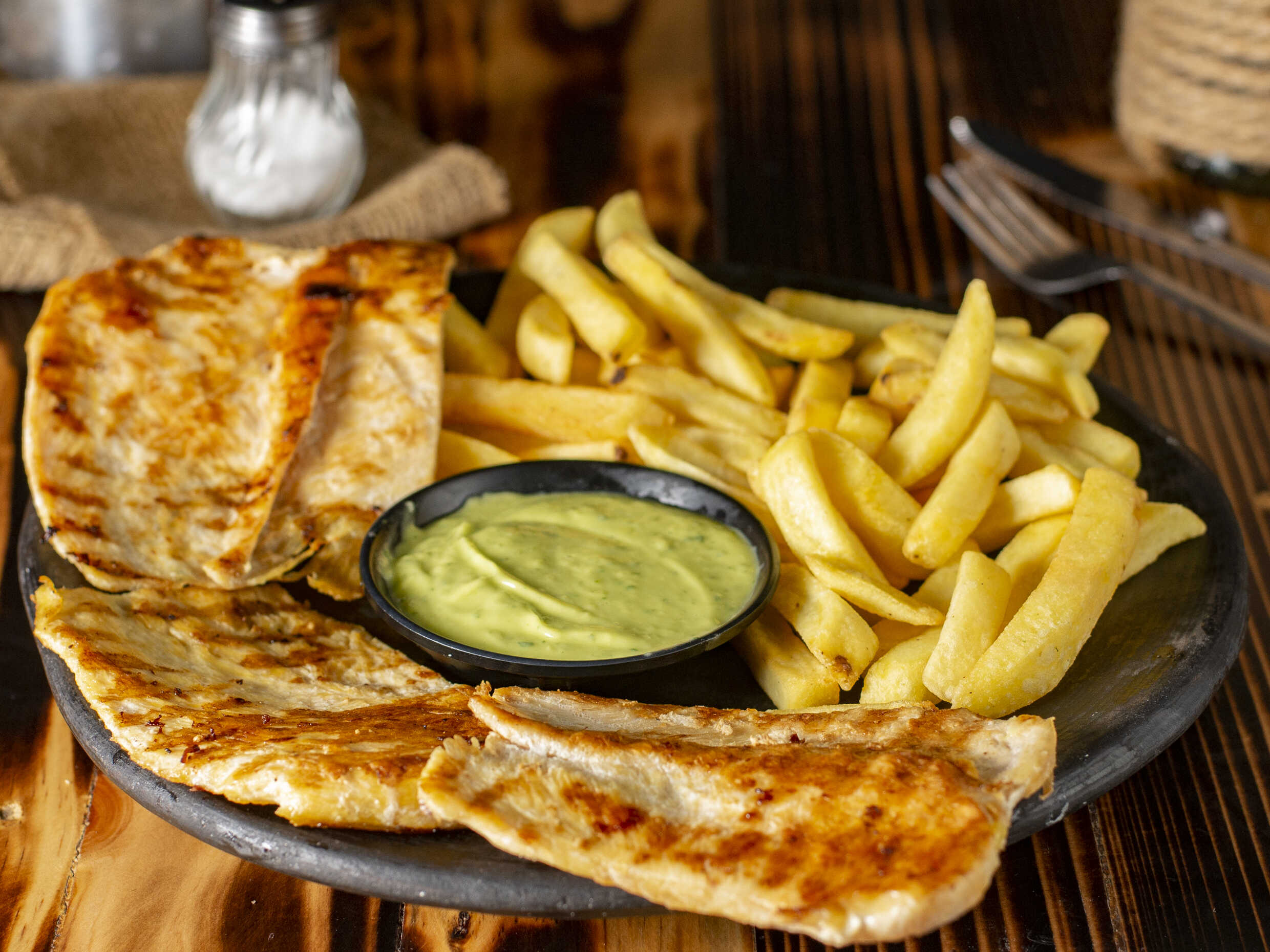 Papa francesa, 250 g de costilla y guacamole.