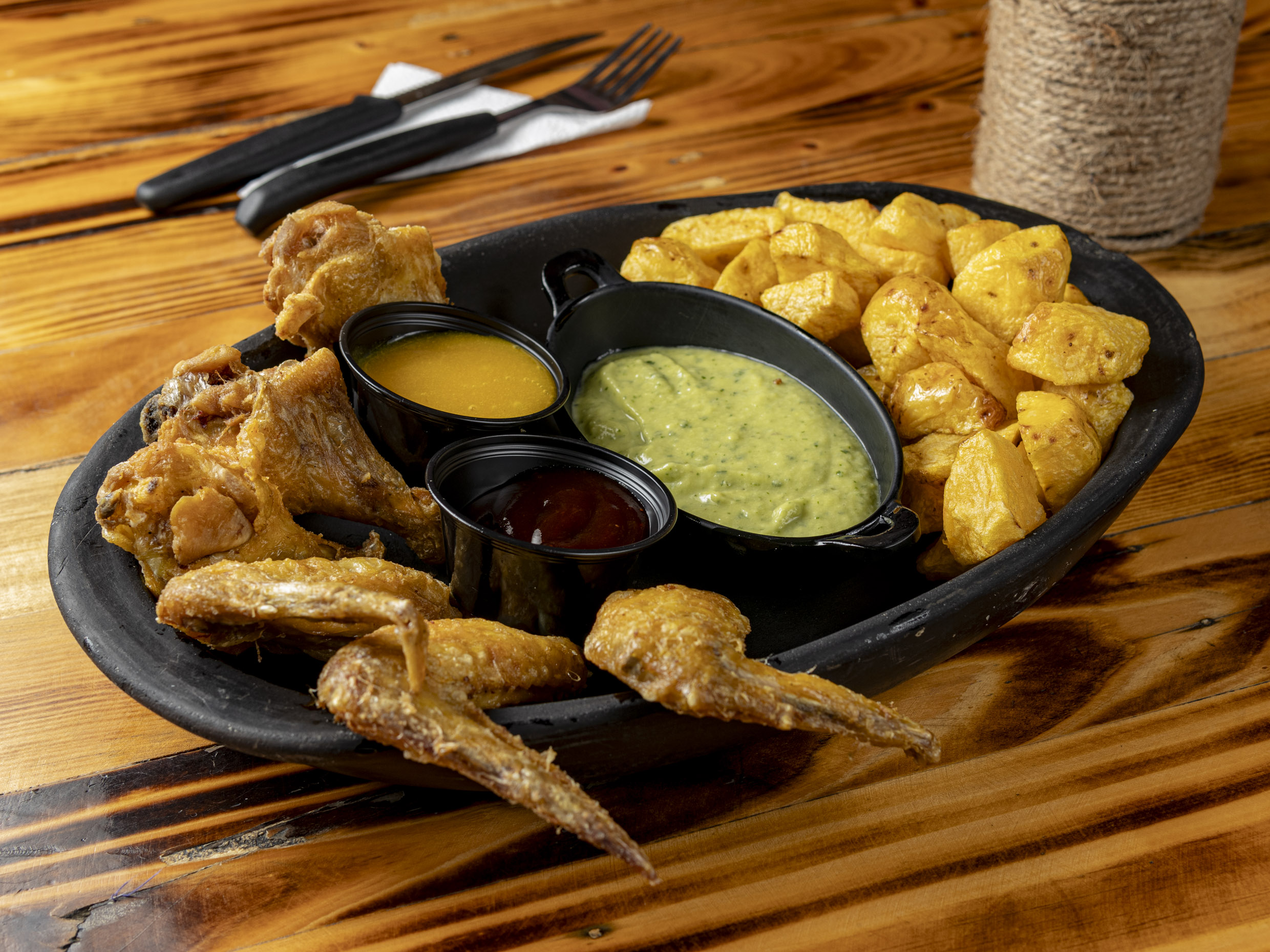 6 Piezas de alitas, porción de papa criolla y guacamole.