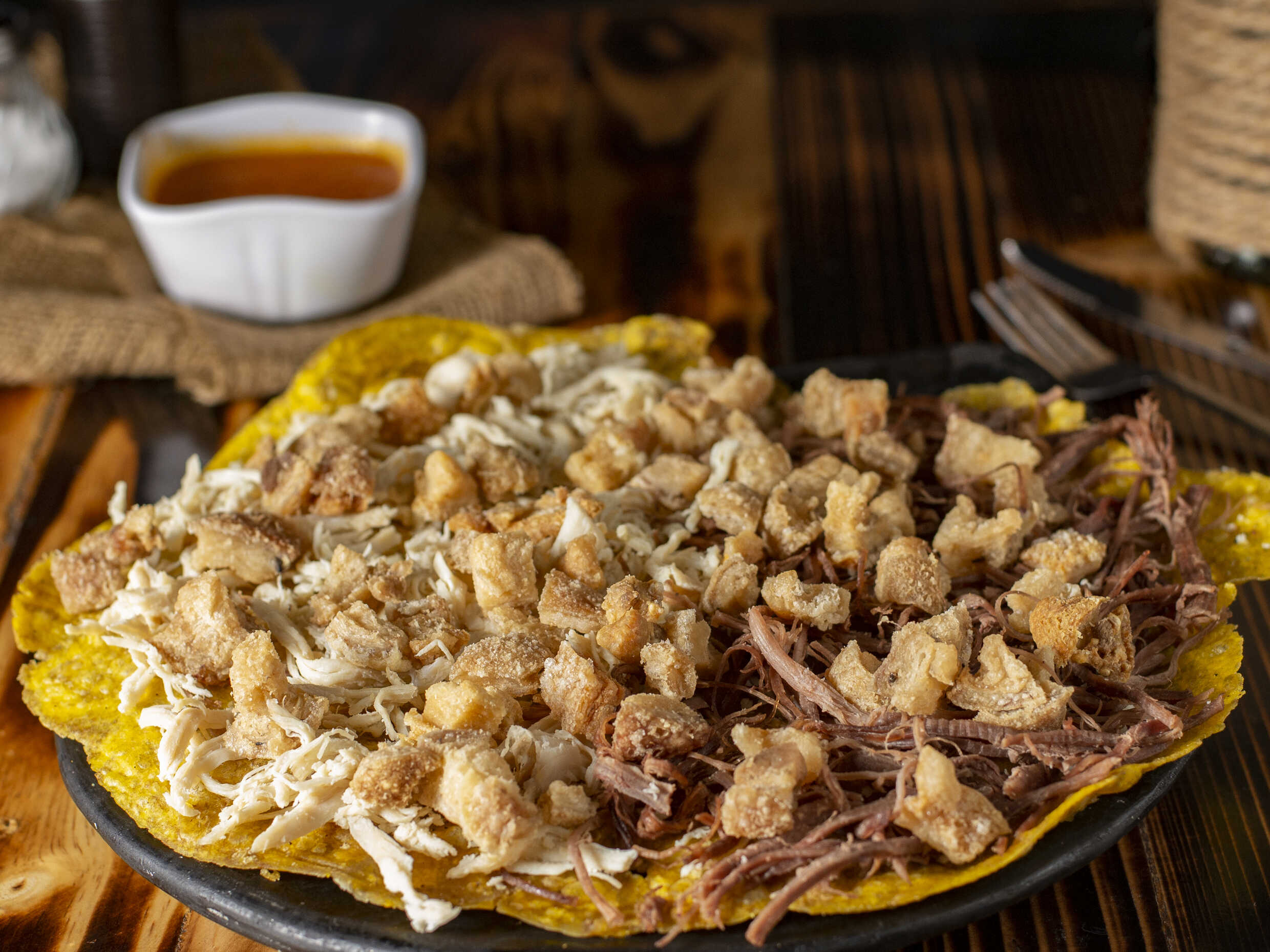 carne desmechada, trocitos de chicharron en salsa criolla, queso gratinado y maicitos.