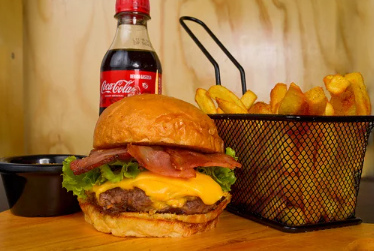 Hamburguesa La Parada: Hamburguesa con 150 gr de carne angus, tocineta, queso americano, cebolla caramelizada, pan artesanal, salsa de la casa, tomate y lechuga. Acompañada con Porción de Papas francesas y Coca-Cola 400ml