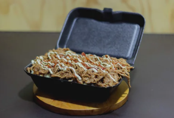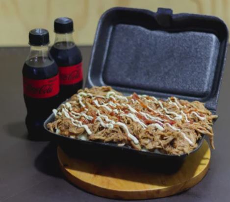 Salchipapa con papa criolla, salchicha ranchera, queso fundido, cerdo desmechado con BBQ y salsas de la casa. Acompañada de 2 gaseosas mini a elección.