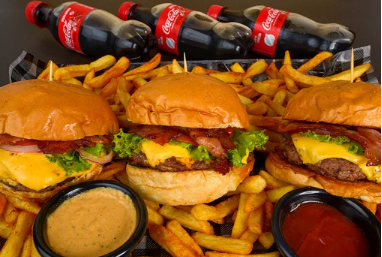 3 Hamburguesas clásicas con queso, 3 porciones de papas francesas y 3 bebidas a elección de 400 ml. Elige las adiciones a tu gusto.