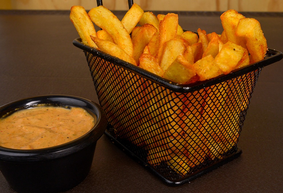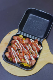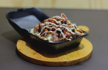 Salchipapa con papa criolla, salchicha ranchera, queso fundido, cerdo desmechado con BBQ y salsas de la casa.