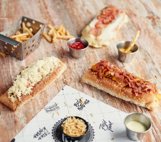 Perro caliente con salchicha americana, queso americano, tocineta, cebolla crispy, salsa de la casa, ripio de papa y cebolla morada.