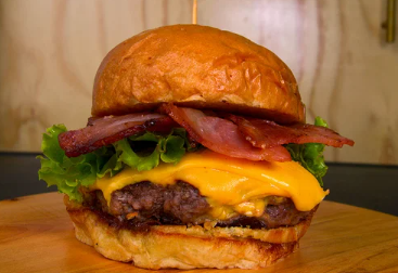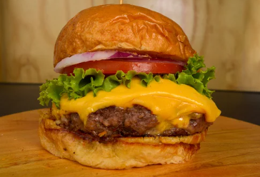 Hamburguesa con 150 gr de carne angus, tocineta, queso americano, cebolla caramelizada, pan artesanal, salsa de la casa, tomate y lechuga.