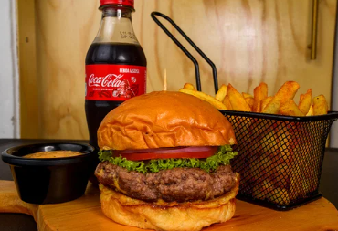 Hamburguesa Clásica con Queso: Hamburguesa con 150 gr de carne angus, queso americano, pan artesanal, salsa de la casa, tomate, lechuga y cebolla morada. acompañada de Porción de Papas francesas y Coca-Cola 400ml