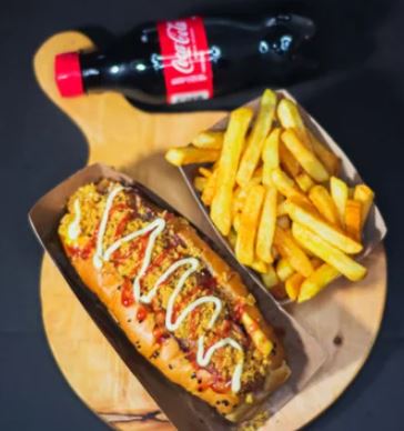 Americano Sencillo: Perro caliente con salchicha americana, salsa de la casa, ripio de papa y cebolla morada. Acompañado de Porción de Papas francesas y Coca-Cola 400ml