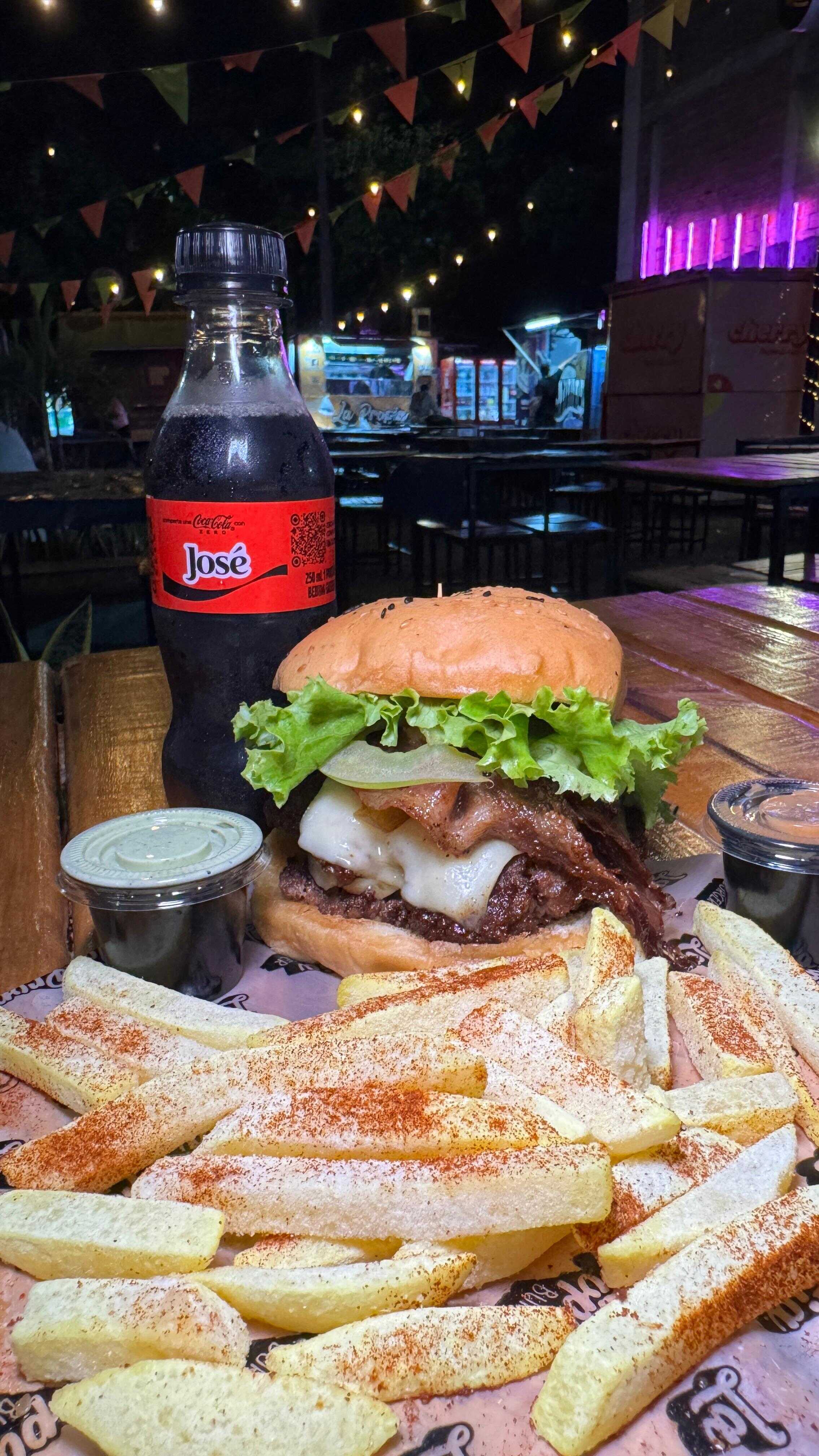 Carne de res de 110g, queso mozzarella, tomate, cebolla caramelizada, lechuga crespa, 1 tira tocineta y salsa propia, Papas a la Francesa y Gaseosa Coca Cola Zaro 250ml