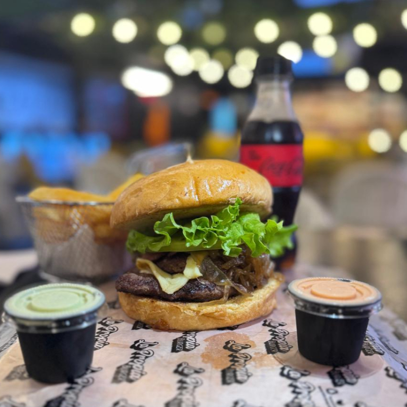 Carne 150 gr, queso mozzarella, tomate, cebolla, lechuga crespa y salsa propia, Papas a la Francesa y Gaseosa Coca Cola Zaro 250ml