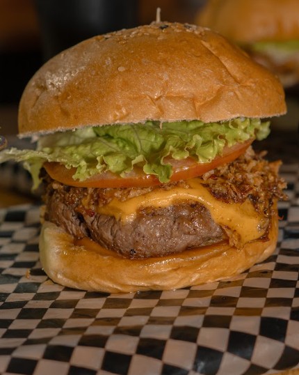 Carne 150g, queso americano, tomate, cebolla crispy, lechuga crespa, tocineta y salsa propia.