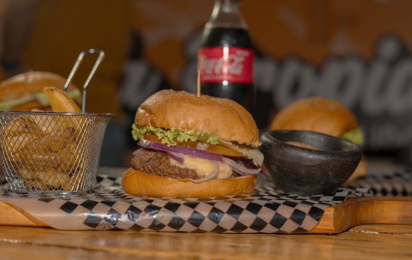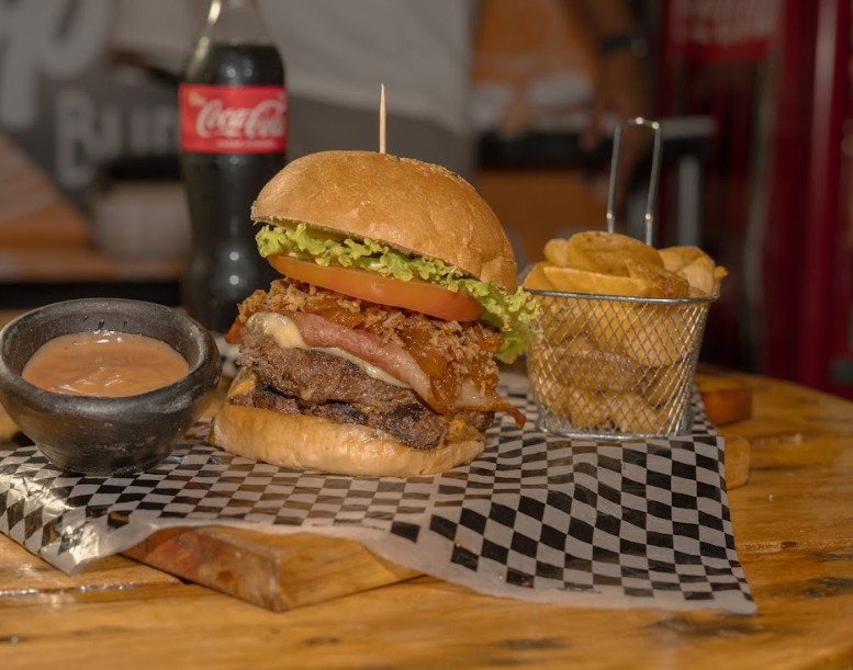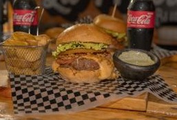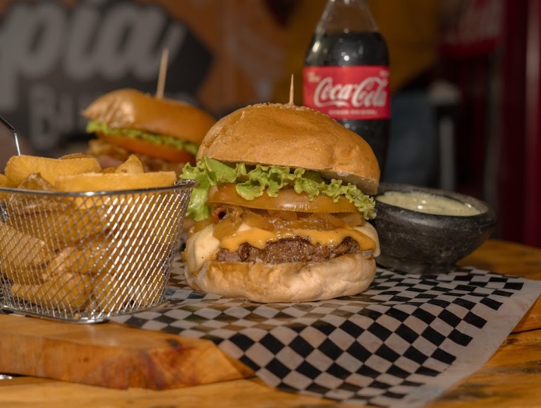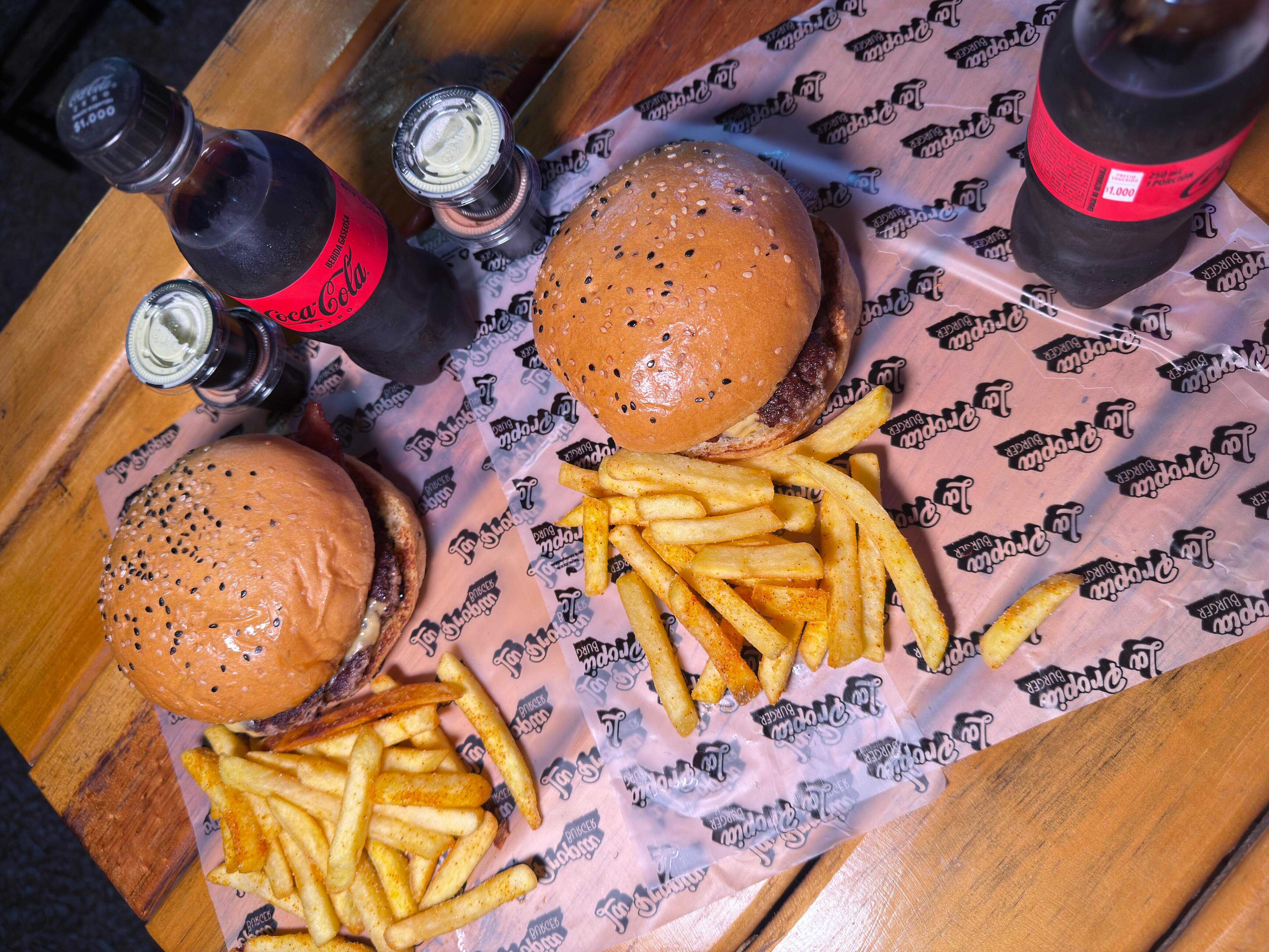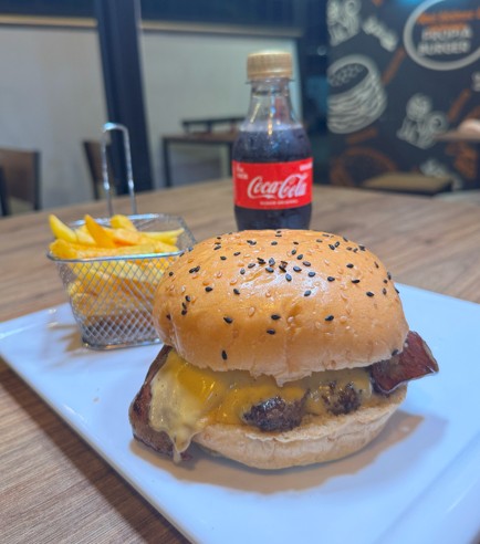 Carne 150 gr, queso mozzarella, tomate, cebolla, lechuga crespa y salsa propia, Papas a la Francesa y Gaseosa Coca Cola Zaro 250ml