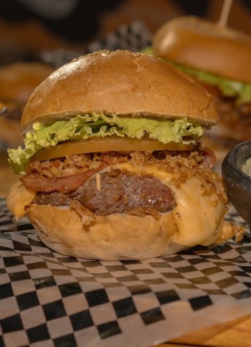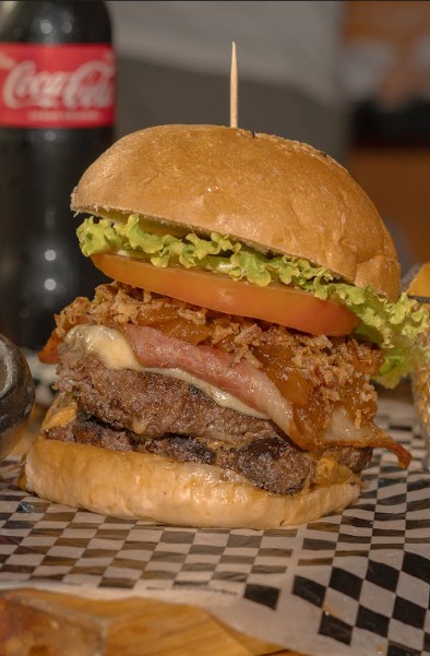 150 gr de carne angus, queso americano, tocineta, 70 gr de Bondiola de cerdo bañada en salsa BBQ, cebolla crispy, tomate y lechuga
