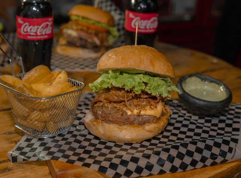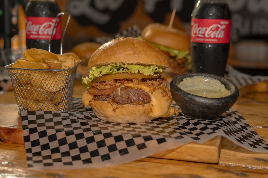 Carne de res de 150g, queso mozzarella, tomate, cebolla caramelizada, lechuga crespa, 1 tira tocineta y salsa propia, Papas a la Francesa y Gaseosa Coca Cola Zaro 250ml