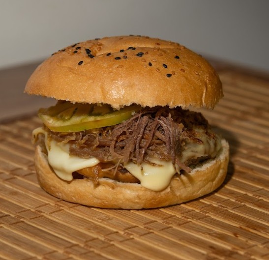 Carne 150 gr Angus, carne desmechada en mermelada Mozarrela, Tomate y Cebolla Crispy