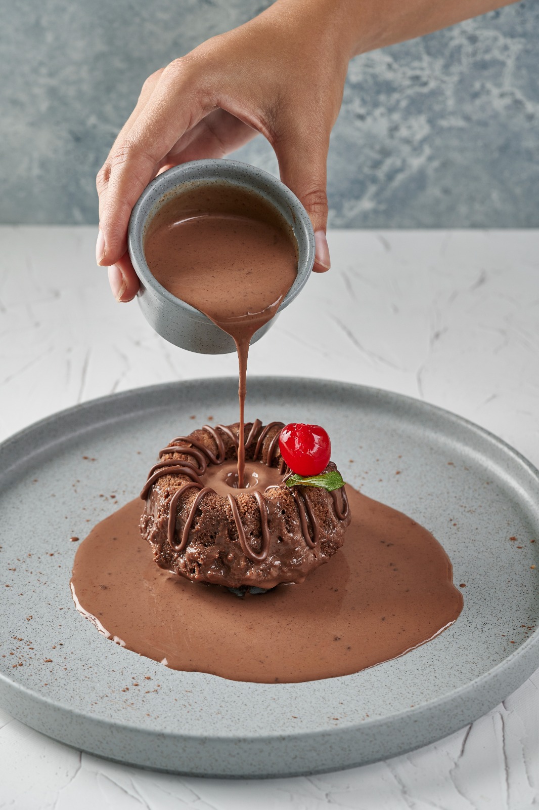 Torta de chocolate semi amargo bañado durante 24 horas con una salsa de chocolate de la casa.