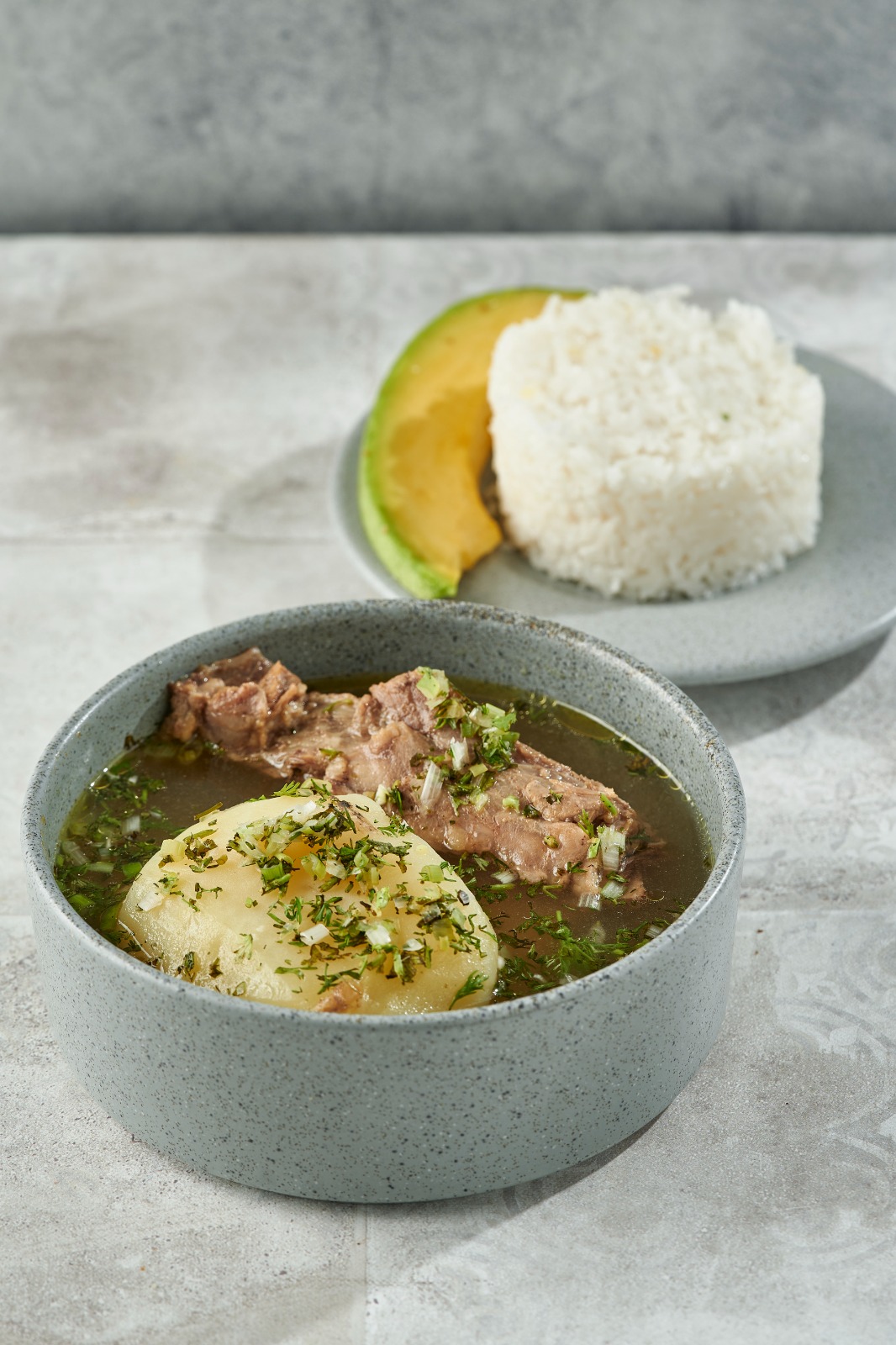 Caldo de costilla de res y papa, acompañados con aguacate, arepa y arroz.