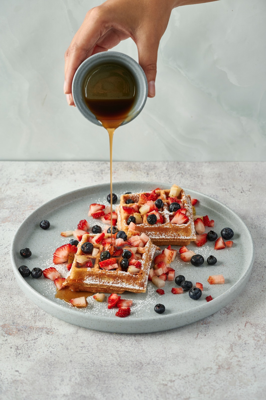 Waffles esponjosos elaborados con una mezcla de harina de arándanos, que aportan un delicado sabor frutal y un toque de color natural. Se acompañan con fresas frescas y un suave baño de miel de maple, creando una experiencia dulce, fresca y reconfortante. Una propuesta perfecta para quienes disfrutan de los sabores naturales con un giro elegante.